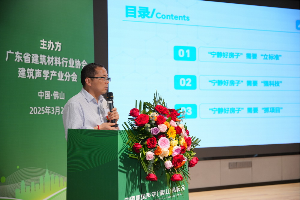 峰會伊始,住房和城鄉建設部建筑雜志社社長宋長明發表重要講話。他指出,“房子”已從有沒有到好不好的時代,房子是百姓居之所向、心之向往,住房城鄉建設部正通過“標準強、科技推、項目抓”三維度落實“好房子”建設,而“隔音”位列購房者最關切的四大問題之首。他期待更多建筑聲學領域的行業專家和企業家深入探討和交流,共同為打造“好房子”貢獻智慧和力量,從政策高度為本次峰會定下基調,強調了建筑聲學對于提升住宅品質的關鍵意義。