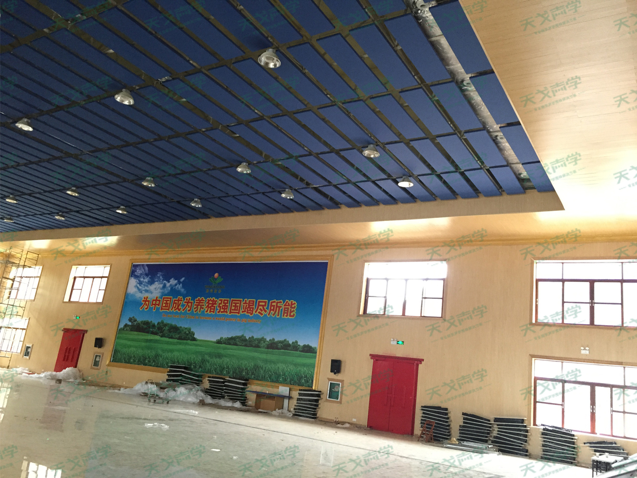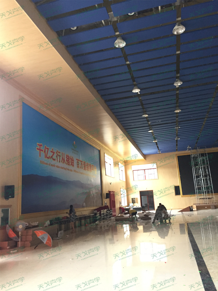 天戈聲學(xué)根據(jù)廣西貴港八墉企業(yè)體育館現(xiàn)有的問題和實(shí)際情況,選用1200平方米的槽木吸音板作為墻面吸音使用,另在體育館頂棚使用了800平方米的吸聲體進(jìn)行吸音,從而使到體育館內(nèi)達(dá)到最佳的混響時間,聲場均勻且清晰度高.