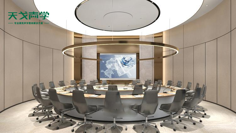 圓桌會議廳位于建筑二層,平面造型為圓形,圓形造型容易產生聲聚焦。要求混響時間達到1.3s-1.5s,需確保會場有足夠的響度、清晰度以及均勻的聲場效果,且需在15天時間內完成工程施工。