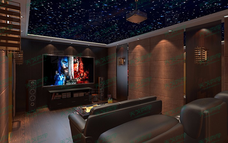 兩側墻采用的是天戈軟包吸音板,突出房間的層次感,頂面加以星空造型,兩者搭配整體格局相得益彰,不僅使整個房間吸音效果達到一個很好的層次,而且兩者搭配的裝修效果也完美融合。整個家庭影院所呈現出來的是,簡約清晰中又不失專業和大氣,低調中彰顯霸氣。