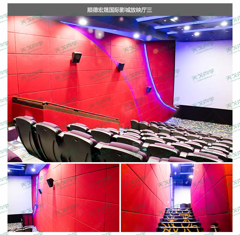 兩側(cè)墻體均采用25mm厚的布藝吸音板(吸音軟包)強(qiáng)吸音材料,該材料為軟質(zhì)材料,在具有強(qiáng)吸聲功能外,還減少了聲音的反射性。另外該材料對光線無反射,符合電影院對聲學(xué)材料的要求。