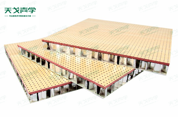 天戈鋁蜂窩復合孔木吸音板飾面顏色及材料選擇性廣,孔徑、孔距可根據客戶要求調整,能很好地滿足客戶多樣化的聲學及裝飾需求。孔木吸音板對吸聲頻譜選擇性較強,對中低頻有很好的吸聲性能。如在吸聲結構后空腔上填入適量的吸聲棉可提高中、高頻吸聲效果。