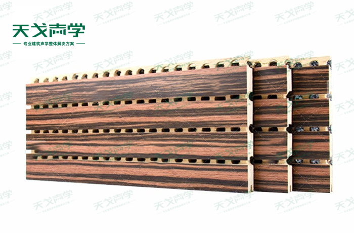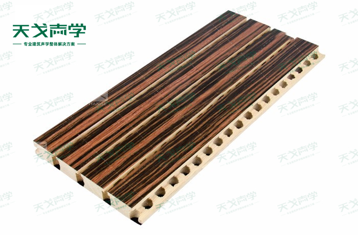 天戈實木槽木吸音板是一種在密度板的正面開槽、背面穿孔的狹縫共振吸音材料。實木槽木吸音板對吸聲頻譜選擇性很強,對中低頻有很好的吸聲性能。若在吸聲結構后空腔填入適量的吸聲棉可提高中、高頻吸聲效果,標準化模塊設計,采用插槽、龍骨結構,安裝簡易,常用于墻面或天花裝飾。