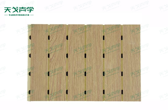 天戈木塑吸音板(WCP槽孔吸聲板)采用生態木的加工工藝,是一種在基材上正面開槽、背面穿孔的狹縫共振吸音材料。使得產品不怕水、不吸水、不龜裂、不變形,且具有傳統裝飾材料的隔熱、防火、防塵、質輕、環保,吸聲效果佳、施工方便等特點。若在吸聲結構后空腔填入適量的吸音棉可提高中、高頻吸聲效果,標準化模塊設計,采用插槽、龍骨結構,安裝簡易,常用于墻面或天花裝飾。