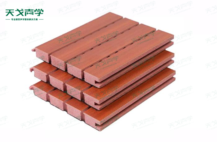 天戈木質阻燃吸音板是一種在密度板的正面開槽、背面穿孔的狹縫共振吸音材料。槽木吸音板對吸聲頻譜選擇性很強,對中低頻有很好的吸聲性能。若在吸聲結構后空腔填入適量的吸聲棉可提高中、高頻吸聲效果,標準化模塊設計,采用插槽、龍骨結構,安裝簡易,常用于墻面或天花裝飾。