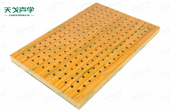 天戈禮堂孔木吸音板飾面顏色及材料選擇性廣,孔徑、孔距可根據客戶要求調整,能很好地滿足客戶多樣化的聲學及裝飾需求。孔木吸音板對吸聲頻譜選擇性較強,對中低頻有很好的吸聲性能。如在吸聲結構后空腔上填入適量的吸聲棉可提高中、高頻吸聲效果。