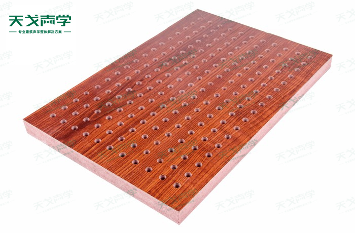 天戈會議室孔木吸音板飾面顏色及材料選擇性廣,孔徑、孔距可根據客戶要求調整,能很好地滿足客戶多樣化的聲學及裝飾需求。孔木吸音板對吸聲頻譜選擇性較強,對中低頻有很好的吸聲性能。如在吸聲結構后空腔上填入適量的吸聲棉可提高中、高頻吸聲效果。
