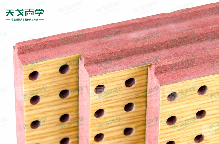 天戈阻燃孔木吸音板飾面顏色及材料選擇性廣,孔徑、孔距可根據客戶要求調整,能很好地滿足客戶多樣化的聲學及裝飾需求。孔木吸音板對吸聲頻譜選擇性較強,對中低頻有很好的吸聲性能。如在吸聲結構后空腔上填入適量的吸聲棉可提高中、高頻吸聲效果。