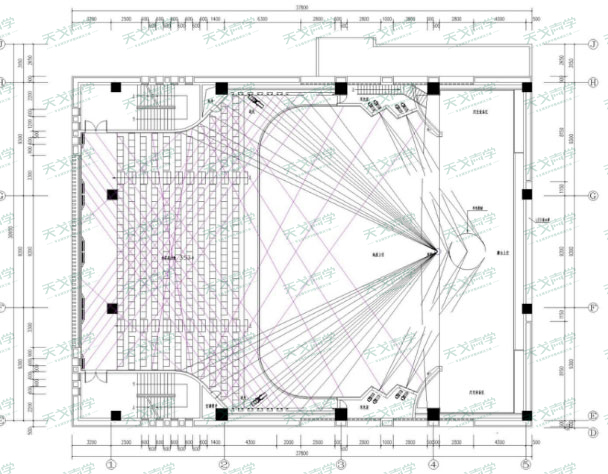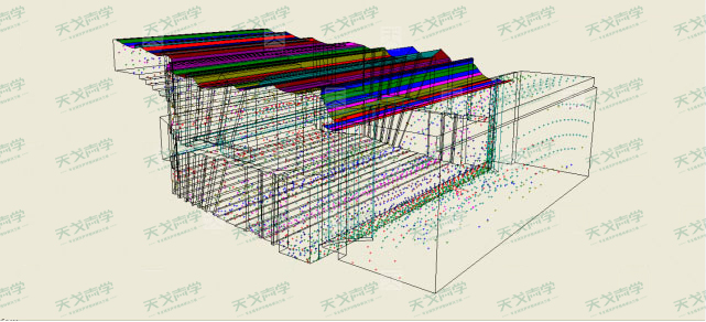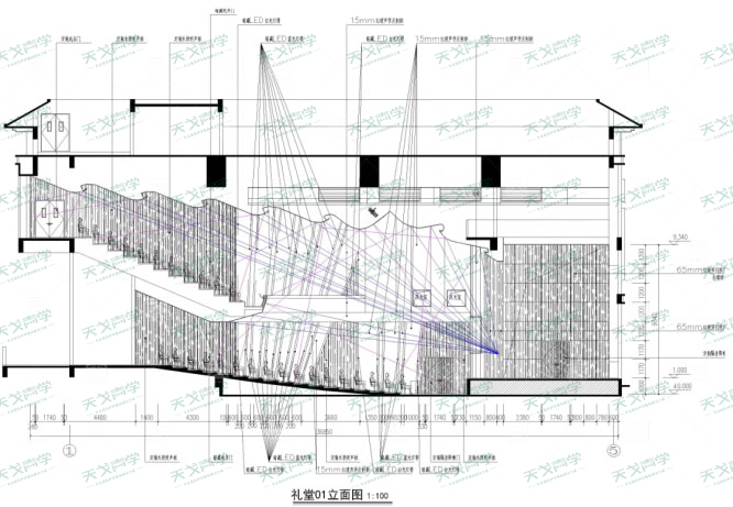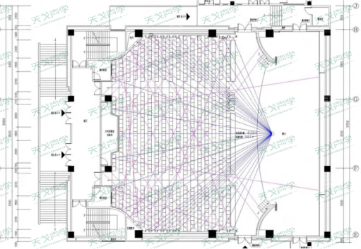 樓座底下為了增加更多的反射聲補(bǔ)充給后排人員,樓座天花調(diào)整成斜坡型后,樓座爭取增多人員可得到良好的反射聲。但最后四排人員需考慮電聲補(bǔ)充聲壓級。注:紫色線為反射聲。
