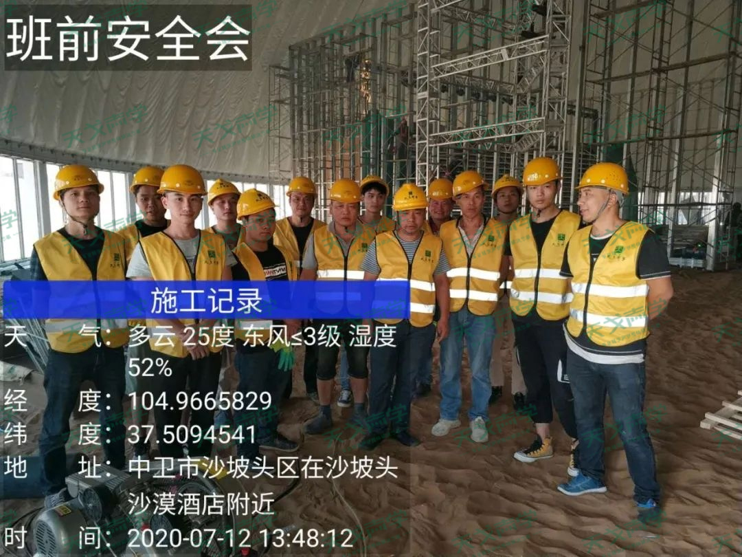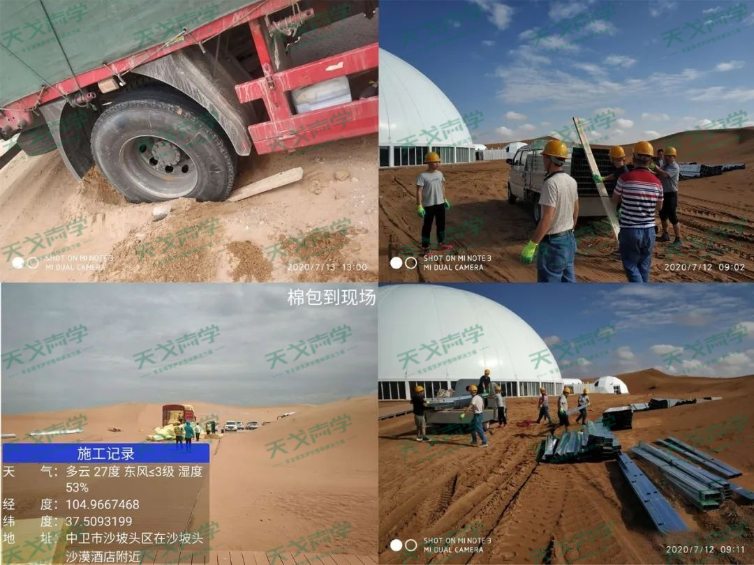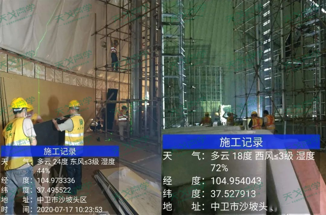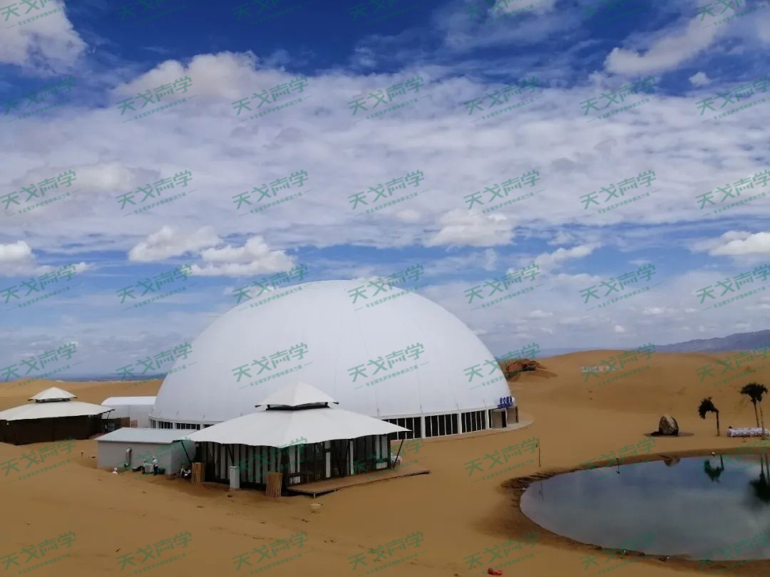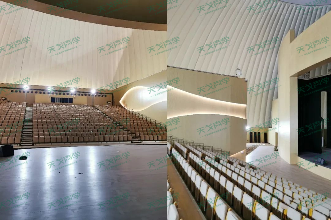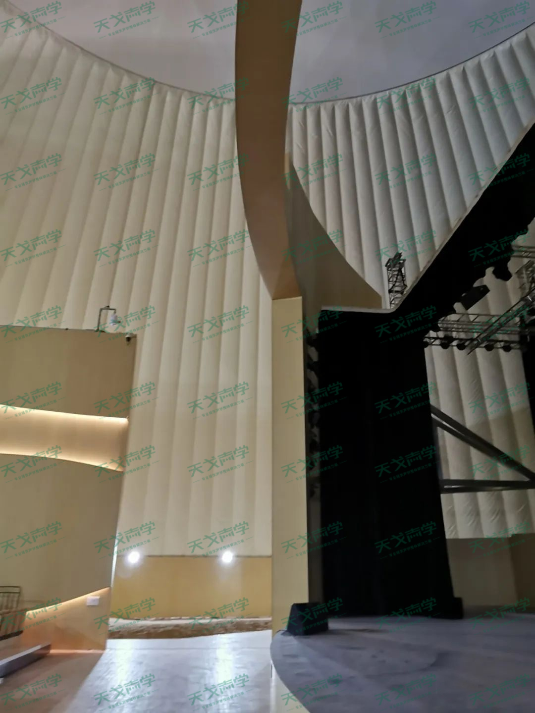由于項(xiàng)目位于沙漠中,劇場(chǎng)的主體建筑工藝有些特殊,沒有實(shí)體墻,室內(nèi)是由氣模組合而成,加上沙漠中惡劣的自然環(huán)境,晝夜溫差大等因素導(dǎo)致了該項(xiàng)目的聲學(xué)裝飾施工難度巨大。這些對(duì)于天戈聲學(xué)來說是一個(gè)挑戰(zhàn)。