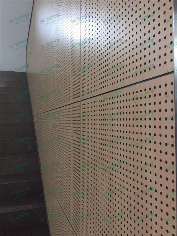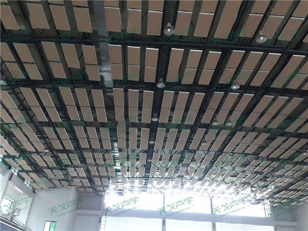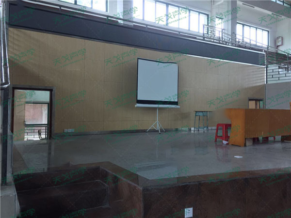 因為工期比較趕,我方全力配合學校的要求加快施工進度和聲學材料生產,施工過程中也遇到些困難,當時考慮安裝天花的聲學材料是高空作業要搭建滿堂架才能施工,但是搭建滿堂架去施工成本就會大大的增加,最后由我們專業的技術團隊解決了此問題,再沒有搭建滿堂架的基礎上安全 保質的完成了天花空間吸聲體的施工,保證了效果也給校方節省了成本。