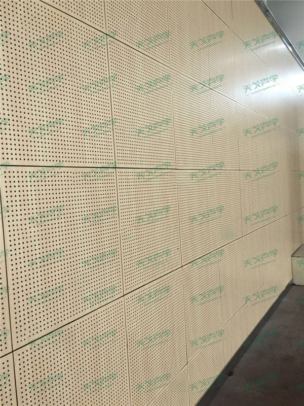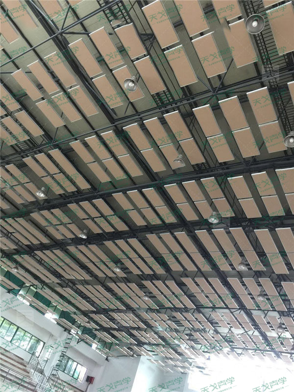 2015年6月學校就此項目立項,2016年10月確定由我公司 佛山天戈科技有限公司進行體育場館的聲學深化和施工。我公司接到此項任務后,首先與設計方共同探討了體育館聲學設計方案,經過一個禮拜的深化和完善,最后制定出合理的聲學方案,墻面采用天戈環保孔木吸音板,天花安裝平板吸聲體,學校領導也一致認可。