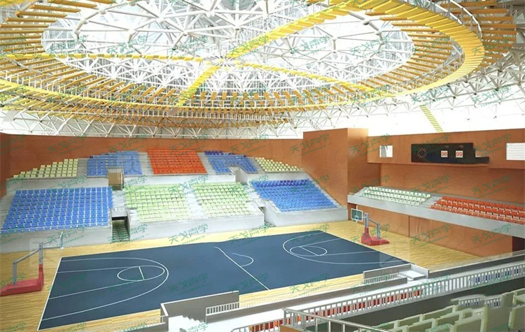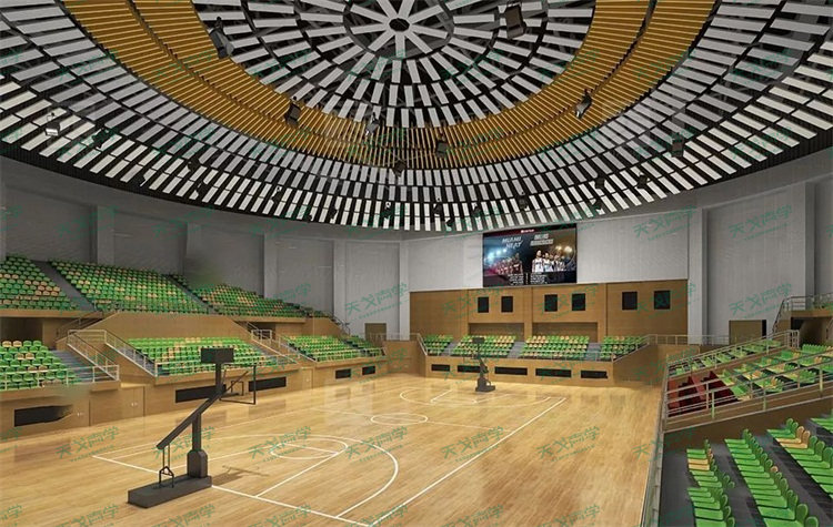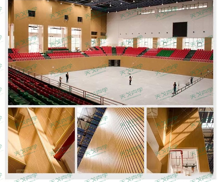 一般來說,由于體育館的的容積較大,平均自由程較長,混響時(shí)間過長,所以存在問題多為聲聚焦、回聲、多重回聲等音質(zhì)缺陷。為此,聲學(xué)環(huán)境整體解決方案服務(wù)商天戈聲學(xué)為山東諸城第一中學(xué)體育場項(xiàng)目提供了空間吸聲體、槽木吸音板以及聚酯纖維吸音板作為主要的吸音材料。