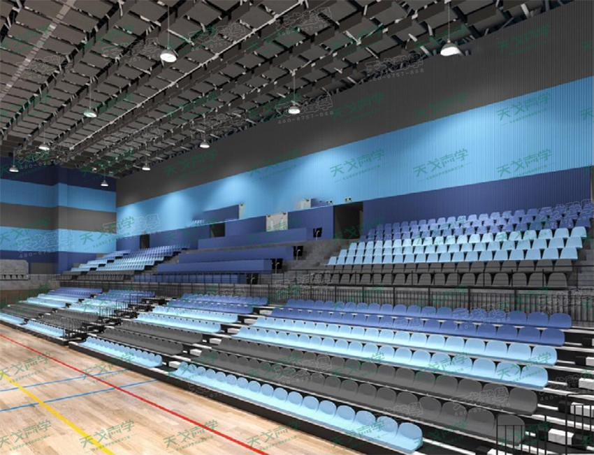 方案設計中,聲學方面采用了藍色的槽鋁吸音板作為場所主要的吸音材料,能很好的降低場所的中低頻段的混響,并通過有效的計算,在頂面安裝一定的低頻空間吸聲體對低頻聲能進行補充吸收。空間裝飾上,結合學校茁壯成長、人杰地靈的元素。營造一種流水般靈動的氛圍。