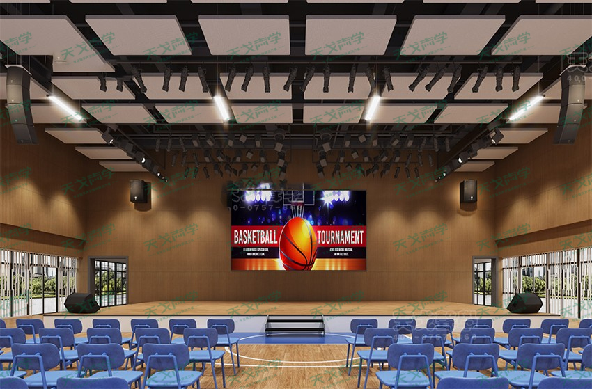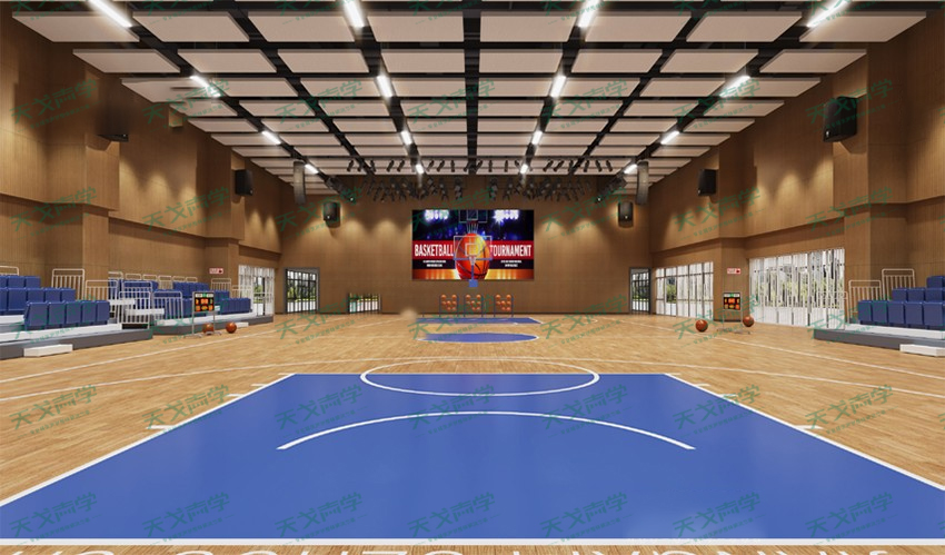方案設計中,聲學方面采用了藍色的槽鋁吸音板作為場所主要的吸音材料,能很好的降低場所的中低頻段的混響,并通過有效的計算,在頂面安裝一定的低頻空間吸聲體對低頻聲能進行補充吸收??臻g裝飾上,結合學校茁壯成長、人杰地靈的元素。營造一種流水般靈動的氛圍。