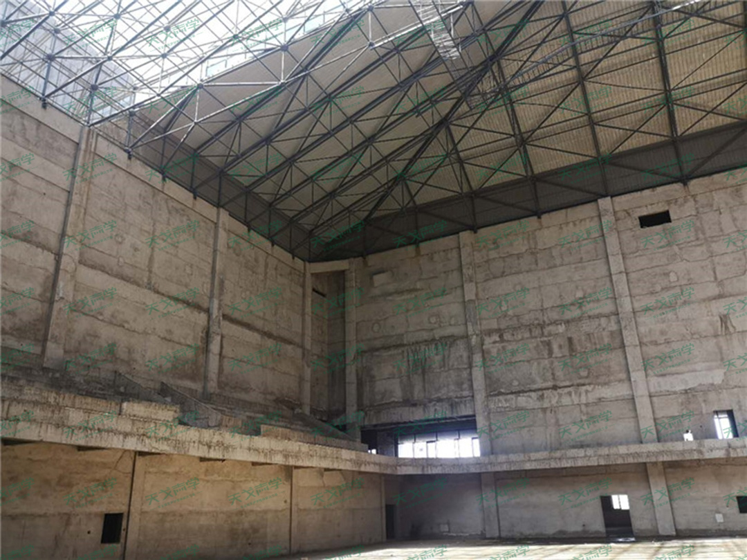 體育館平面呈一矩形,剖面為不規則幾何形,館內頂面鋼架距離建筑地面最高高度為35m,縱長56.7m。館內有效容積為79185m3,總表面積為11340㎡,預計容納人數3000人。