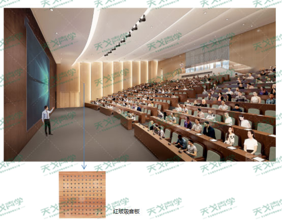 為了使階梯教室具有適宜的響度及語(yǔ)言清晰度,在兩側(cè)墻面、觀眾后墻面吸音板處采用紅玻吸音板,內(nèi)填50厚32K吸聲棉包,安裝空氣層不少于100mm,背景墻面及其他部位均安裝木飾面。