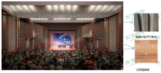 根據(jù)報(bào)告廳的裝飾效果,為了使報(bào)告廳具有適宜的響度及語(yǔ)言清晰度,在兩側(cè)墻面木紋吸音板處采用紅玻吸音板,內(nèi)填50厚32K吸聲棉包,安裝空氣層不少于100mm,其他部位均安裝木飾面。