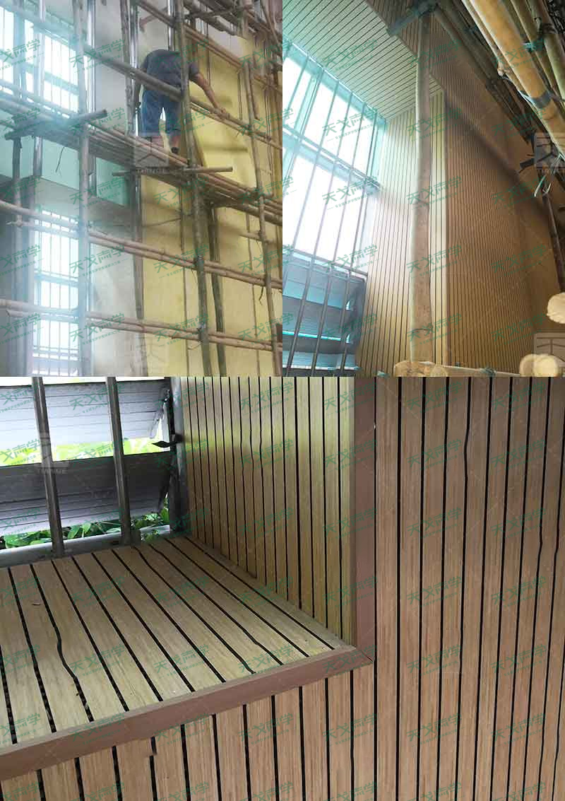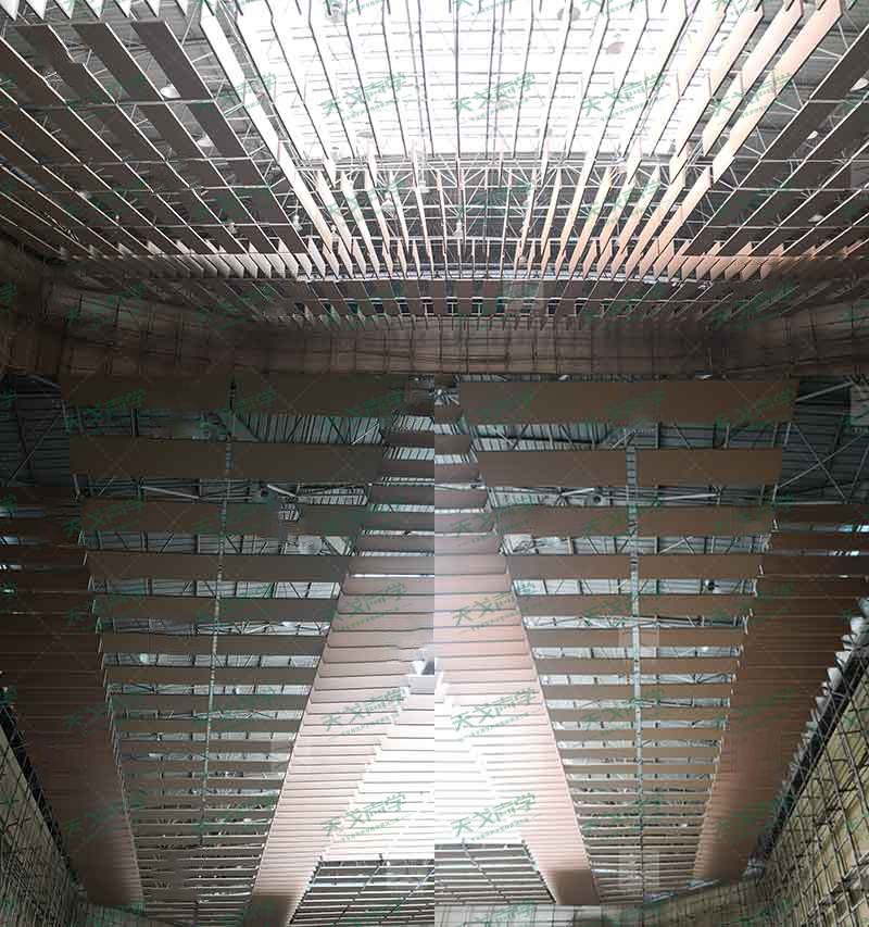 天戈體育館槽木吸音板是一種在密度板的正面開槽、背面穿孔的狹縫共振吸音材料。槽木吸音板對(duì)吸聲頻譜選擇性很強(qiáng),對(duì)中低頻有很好的吸聲性能。若在吸聲結(jié)構(gòu)后空腔填入適量的吸聲棉可提高中、高頻吸聲效果,標(biāo)準(zhǔn)化模塊設(shè)計(jì),采用插槽、龍骨結(jié)構(gòu),安裝簡(jiǎn)易,常用于墻面或天花裝飾。